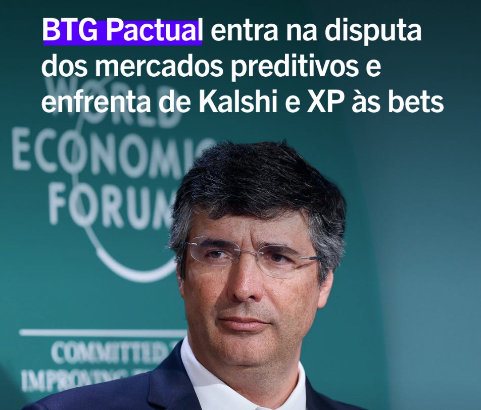 Agora, isso chega no Brasil. A XP se movimentando com a Kalshi. A B3 abrindo espaço. E o BTG entrando com a Trends, focando em clientes sofisticados. Não estamos falando de experimentos. Estamos falando de três das maiores forças do mercado financeiro brasileiro disputando a liderança de uma nova categoria.