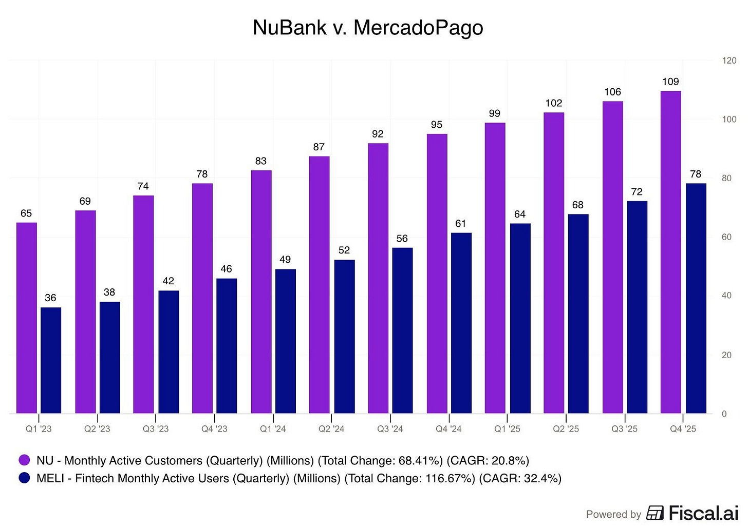 Do outro lado, o Mercado Pago cresce mais rápido. Salta de 36 para 78 milhões de usuários ativos no mesmo período. Um avanço de mais de 116%, com um detalhe que passa despercebido: ele não cresce sozinho. Ele cresce acoplado ao maior motor de transações da América Latina.